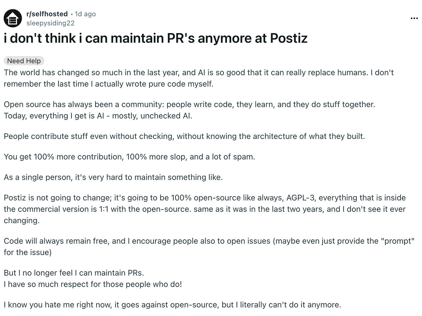 So, yes. Postiz author has been deliberately building a slop machine for the best part of the last two years. Making it easier for “content creators” to just generate garbage content and spam all sorts of platforms and social networks. They’ve not only been deliberate, but they’ve actively encouraged other people to do the same. And now, out of the blue, they come out complaining about the slop code suddenly flooding their PRs pipeline.