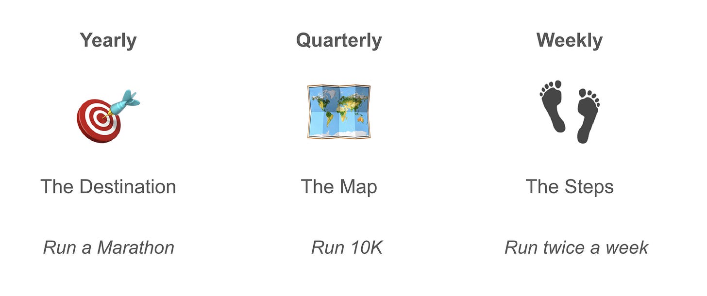 For each one of your yearly goals, you should identify the key milestone for Q1. What’s the single most important milestone you want to achieve by then? Achieving is the keyword here. These should be measurable outcomes, similar to the ones you set at the yearly level, but more granular and likely incremental. See the picture above with the marathon running target for an example.